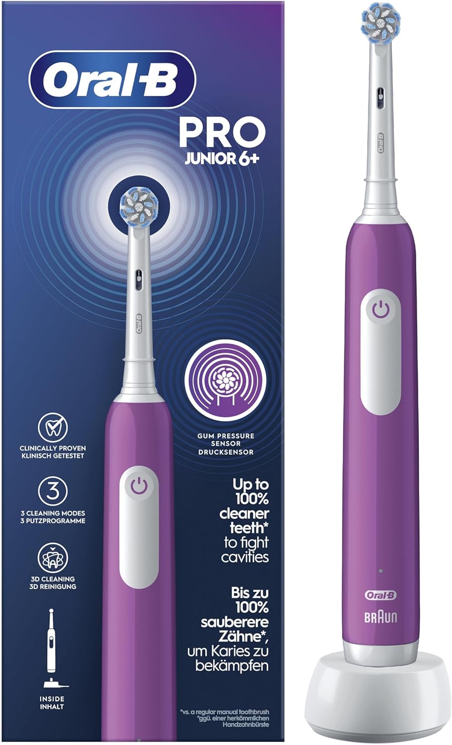 Conseguir que los niños se cepillen los dientes puede ser todo un desafío. Los divertidos colores de los cepillos de dientes eléctricos recargables Oral-B Junior, aptos para niños mayores de 6 años, pueden ayudar a motivar a los más pequeños para inculcarles hábitos sanos de por vida.